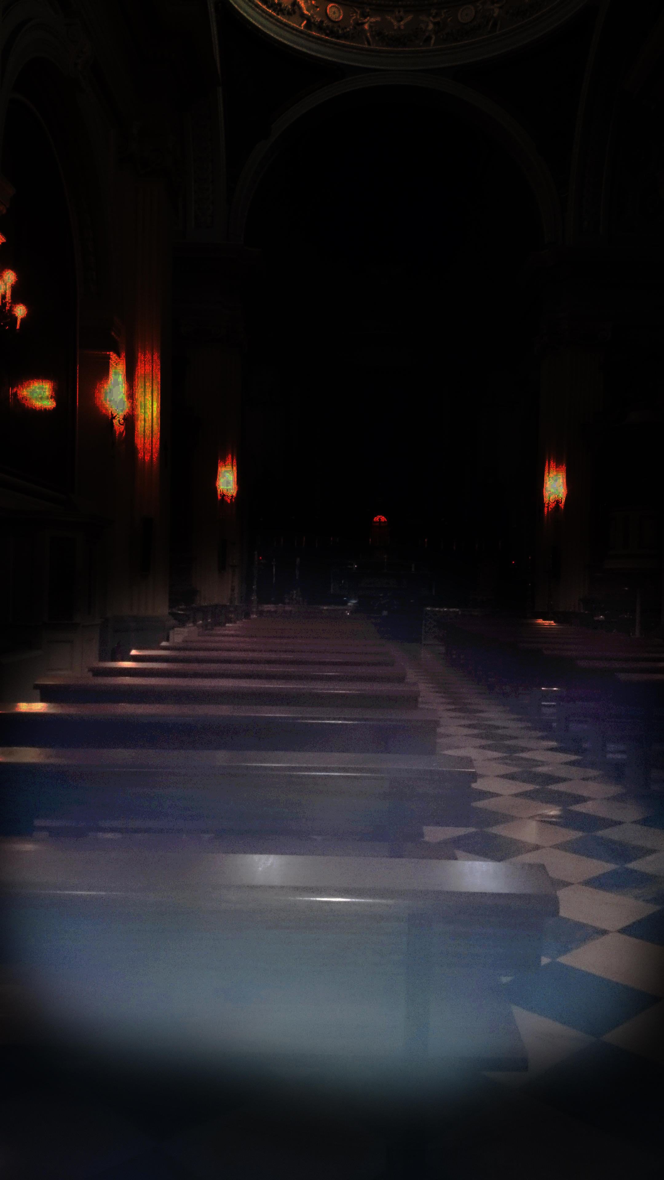 Al traspasar la portada, el interior de la iglesia está oscuro. Linterna en mano y grabadora encendida, nos disponemos a entrar en ella. El frío se deja notar con ganas y el amaderado e intenso olor a sándalo impregna el ambiente. A pocos metros de la entrada, Jesús me agarra y tira de mí con fuerza. ¡Hay un hombre sentado en una silla! Delante de nosotros, adormilado con la cabeza descansando sobre la mano y el codo apoyado en el brazo de la silla, la figura de un hombre resplandece en la oscuridad. Es un anciano que con sus temblorosos dedos sujeta un viejo pincel apunto de desplomarse. Entre sus pies, se pueden distinguir una calavera, un libro, un reloj dorado de sobremesa y una careta de carnaval esparcidos por el suelo de cualquier manera. Al percatarse de nuestra presencia, recobra inquieto la compostura y tras recoger los extraños objetos del suelo, se aleja de nosotros alertándonos del peligro que corremos si la “Divina” nos encuentra. Sin dirigirnos la mirada, se adentra en una de las capillas hasta desvanecerse entre las tinieblas de la iglesia, mientras escuchamos su voz ya lejana contestar a mi pregunta del por qué hemos de tener cuidado con ella: